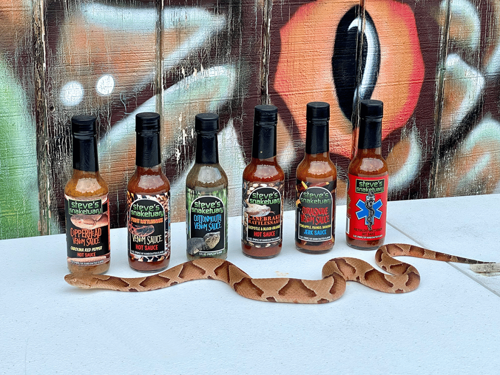 Kennedy’s facility has everything from large pythons to baby rattlers, and everything in between. He even has a signature hot sauce line, with heat levels and flavors tailored to types of snakes. The line includes six different flavors.