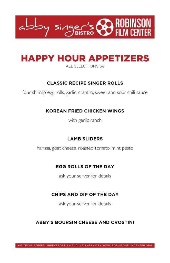 Happy Hour just got happier at Abby Singer’s Bistro, located on the second floor of the Robinson Film Center. Their specials run Tuesday through Friday from 4pm until 6:30pm.