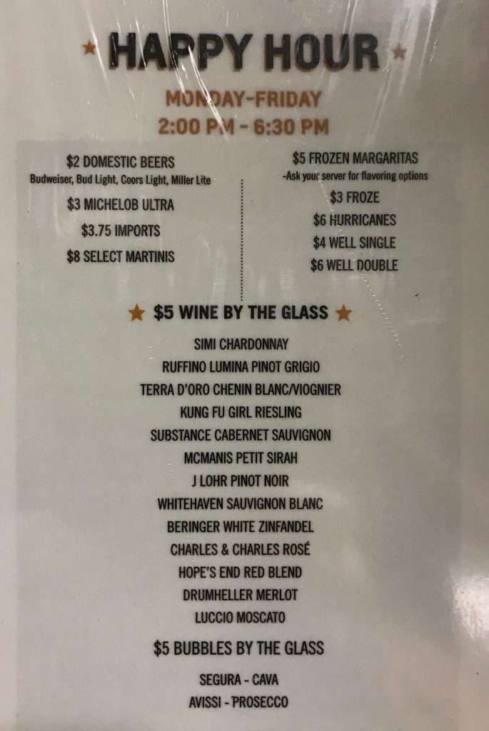 During Happy Hour they have half price well cocktails, house wines, and domestic beer. They also offer additional daily beverage specials including: